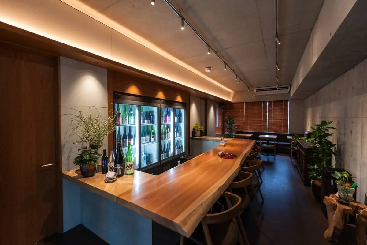 うめきたエリアに構える梅田の喧騒を離れた場所に、夫婦で営む静かな隠れ家がございます。コンクリート打ちっぱなしのモダンな空間に横たわるのは、一枚板を贅沢に使ったカウンターです。全国から厳選した日本酒と、素材を活かした創作料理のペアリングが、日常を忘れる上質なひと時を演出いたします。お酒を嗜む方はもちろん、ノンアルコールでもご堪能いただけるダイニングバーです。